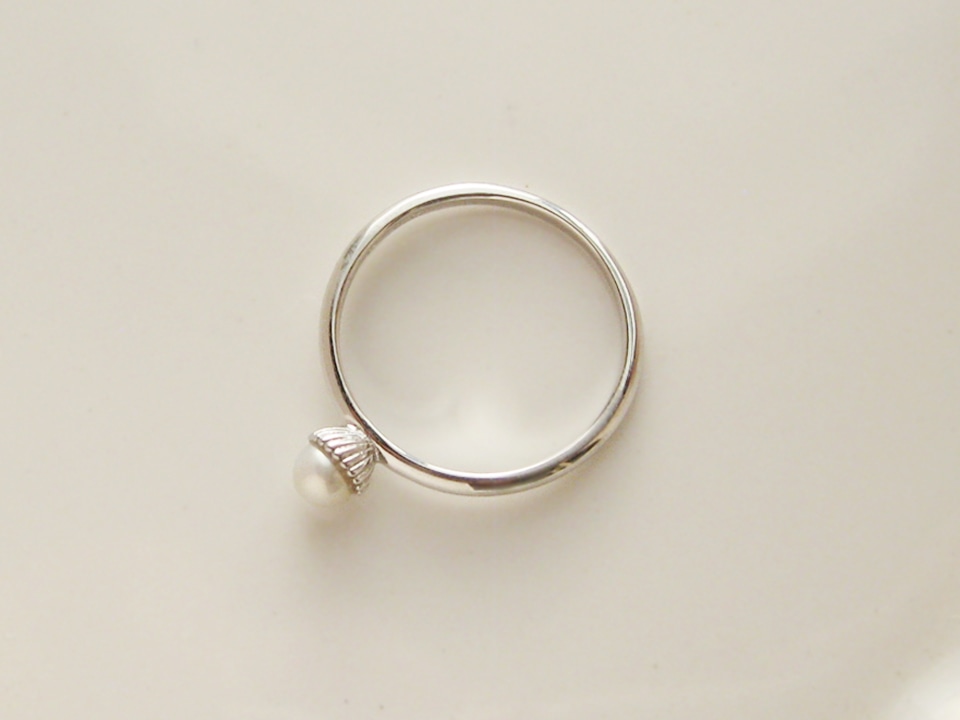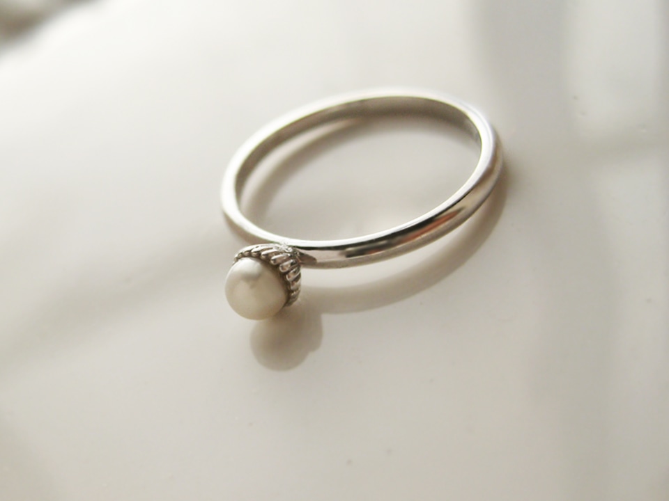 小さくて丸いパールが石座から半分ぷっくりと出ていて可愛いリングです。